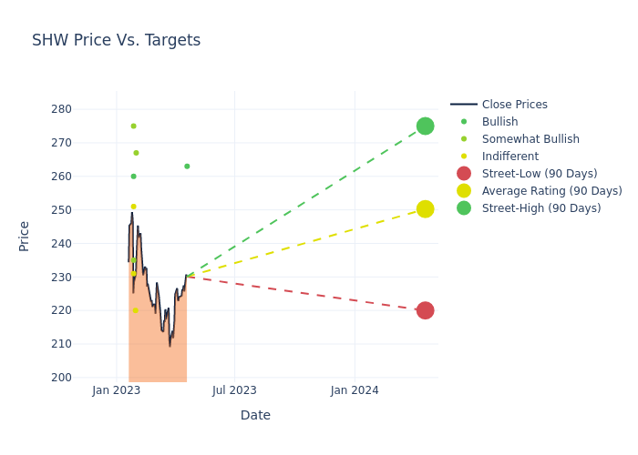 In the last 3 months, 9 analysts have offered 12-month price targets for Sherwin-Williams. The company has an average price target of $250.78 with a high of $275.00 and a low of $220.00.