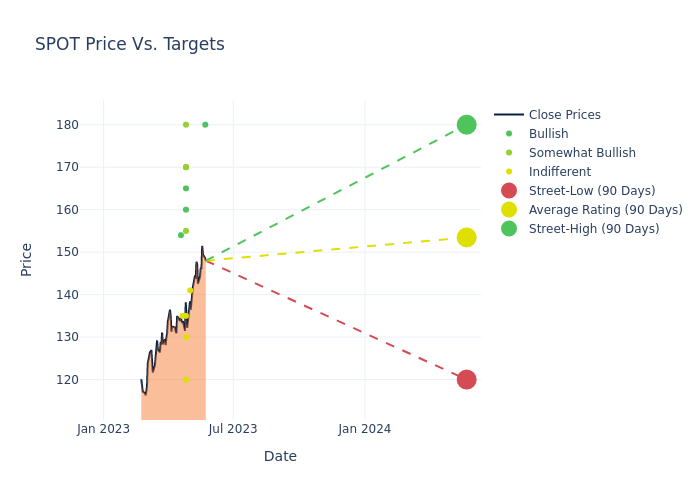 According to 19 analyst offering 12-month price targets in the last 3 months, Spotify Technology has an average price target of $153.42 with a high of $180.00 and a low of $120.00.