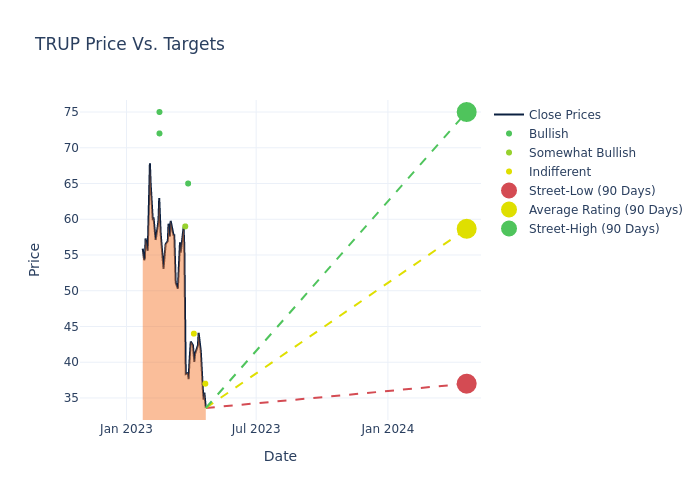According to 7 analyst offering 12-month price targets in the last 3 months, Trupanion has an average price target of $59.29 with a high of $75.00 and a low of $37.00.