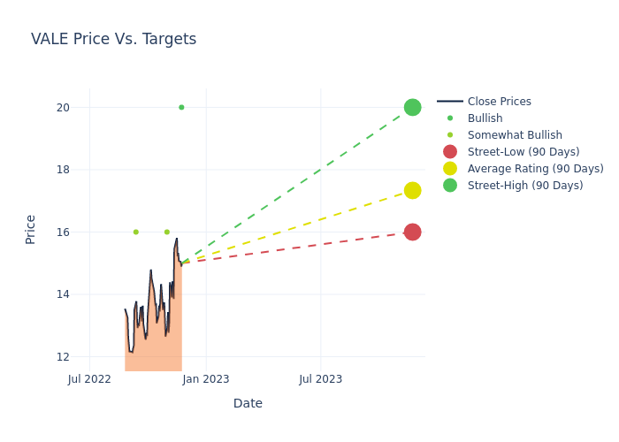 In the last 3 months, 4 analysts have offered 12-month price targets for Vale. The company has an average price target of $17.75 with a high of $20.00 and a low of $16.00.