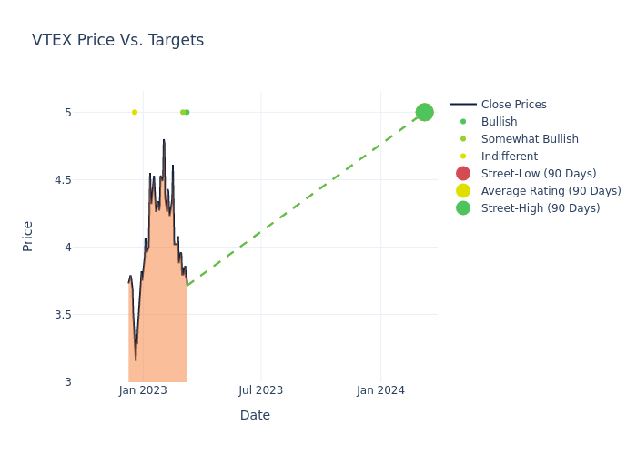 According to 4 analyst offering 12-month price targets in the last 3 months, Vtex has an average price target of $5.0 with a high of $5.00 and a low of $5.00.