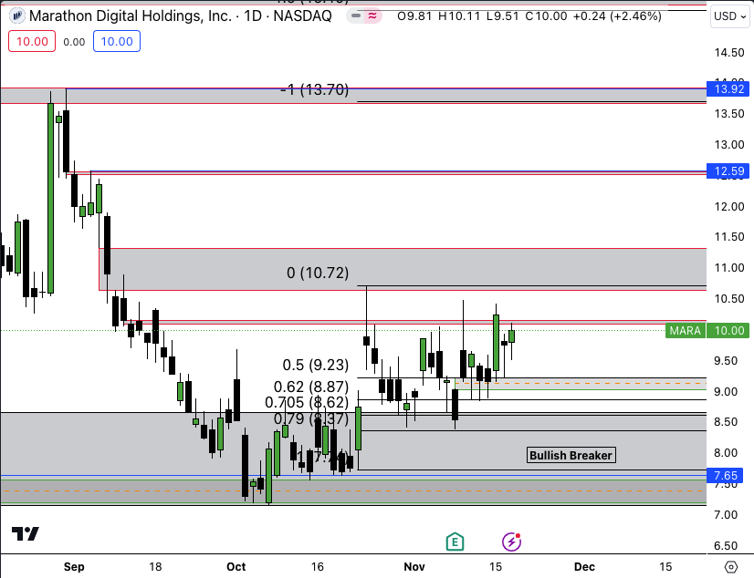 Marathon Digital Holdings, Inc. (NASDAQ:MARA) Daily Target is 10.72 and a full fill of the bearish imbalance occurs at 11.50. Ideally bulls will get an imbalance to the upside to set up for the next leg up later.