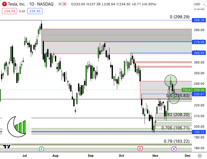 Tesla, inc. (NASDAQ:TSLA) Daily Santa decided to show up before Thanksgiving. No worries, Mando was prepared before the arrival with cookies and milk. Perfect rejection of the daily bearish volume imbalance and perfect hold of previous resistance as support. Model completes at 299.29