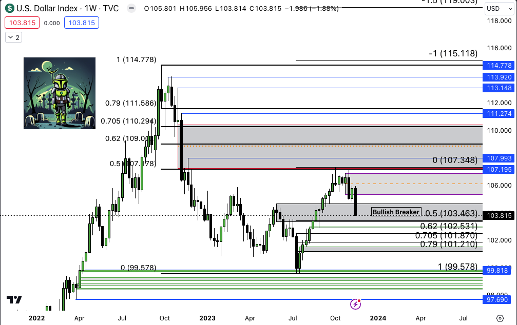 $DXY Weekly Not much bullish about the dollar right now. Discount bearish imbalance rejection a few weeks ago and since price has faded. Approaching discount of the bullish price run it has made off the lows, with a bullish breaker sitting right at 50%. I favor HTF bearish
