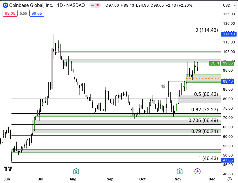 Coinbase Global, Inc. (NASDAQ:COIN) Daily Dip into a bullish volume imbalance and held previous swing high at 89.40 early in the week before running higher yet again to close. Mando Model completes 114.43!