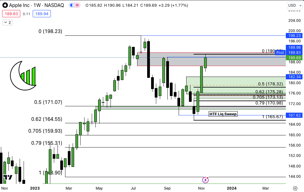 Apple Inc. (NASDAQ:AAPL) Weekly They played with fire again… Swing high at 189.83 swept Weekly did close below that level, something to keep an eye on. Ultimate destination 198.23