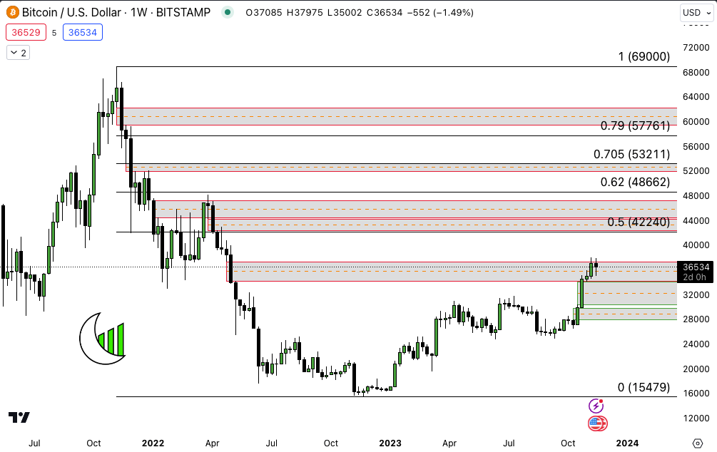 Bitcoin (CRYPTO: BTC) Weekly No break just yet… Two bullish imbalances below. 42,000 resting right at 50% of the range!