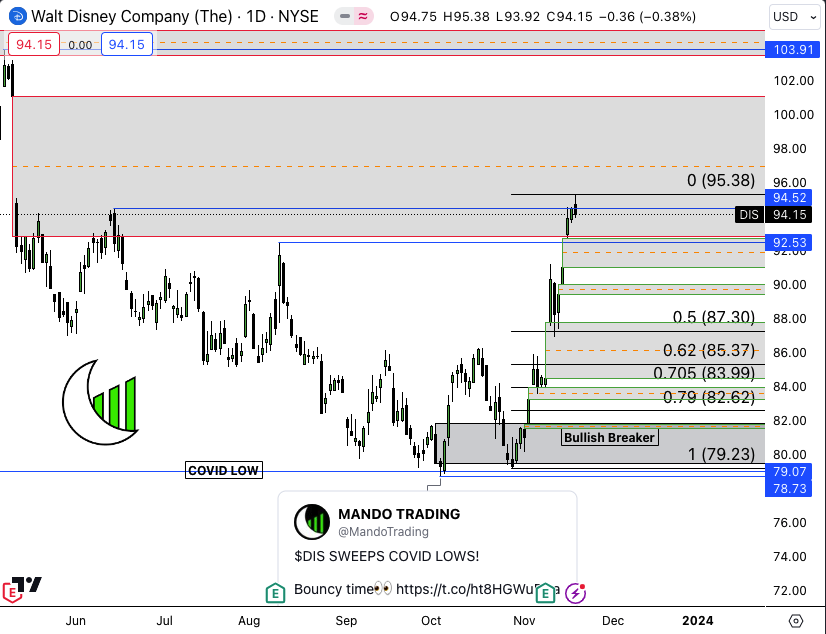 Walt Disney Company (NYSE:DIS) Daily WE. LOVE. OLD. TWEETS. Calling this price action like you call your ex after a night out drinking. We got back into the large bearish imbalance from 2 earnings ago. Price also swept buyside liquidity. A retracement is completely healthy and logical.