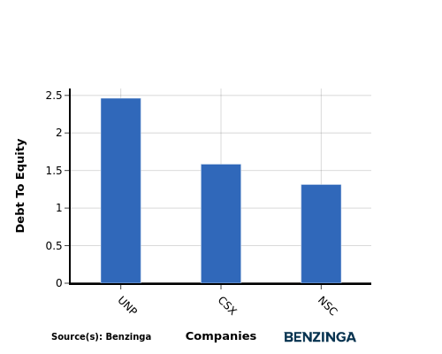 CSX falls in the middle of the list when considering the debt-to-equity ratio.