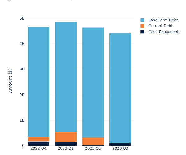 Based on JM Smucker’s financial statement as of February 28, 2023, long-term debt is at $4.31 billion and current debt is at $0, amounting to $4.31 billion in total debt. Adjusted for $104.20 million in cash-equivalents, the company’s net debt is at $4.21 billion.