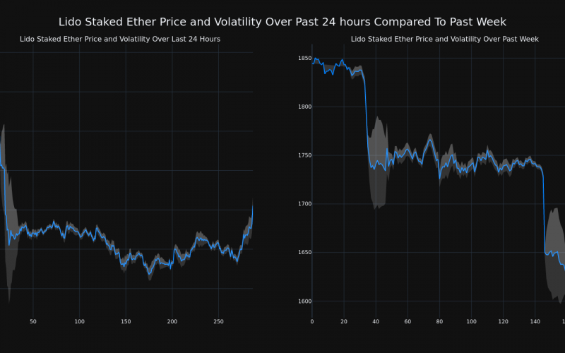 The chart below compares the price movement and volatility for Lido Staked Ether over the past 24 hours (left) to its price movement over the past week (right). The gray bands are Bollinger Bands, measuring the volatility for both the daily and weekly price movements. The wider the bands are, or the larger the gray area is at any given moment, the larger the volatility.