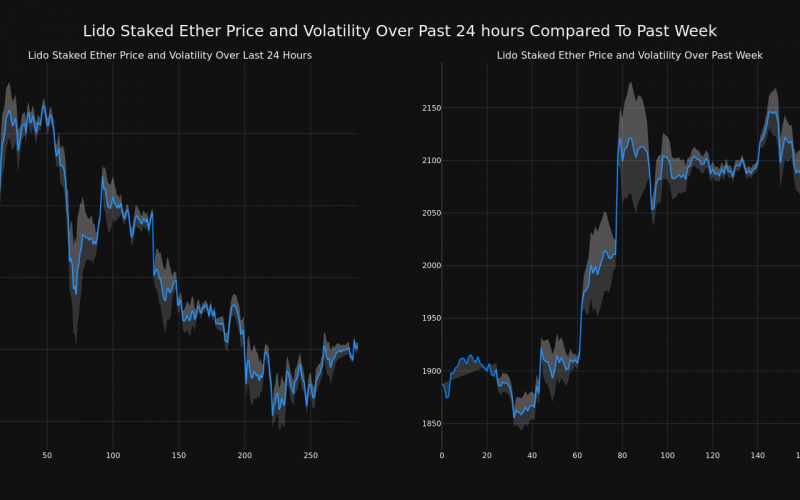 The chart below compares the price movement and volatility for Lido Staked Ether over the past 24 hours (left) to its price movement over the past week (right). The gray bands are Bollinger Bands, measuring the volatility for both the daily and weekly price movements. The wider the bands are, or the larger the gray area is at any given moment, the larger the volatility.