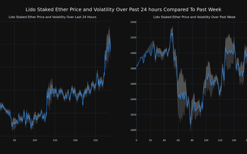 The chart below compares the price movement and volatility for Lido Staked Ether over the past 24 hours (left) to its price movement over the past week (right). The gray bands are Bollinger Bands, measuring the volatility for both the daily and weekly price movements. The wider the bands are, or the larger the gray area is at any given moment, the larger the volatility.