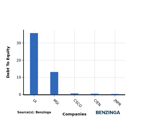 Cisco Systems is positioned in the middle in terms of the debt-to-equity ratio compared to its top 4 peers.
