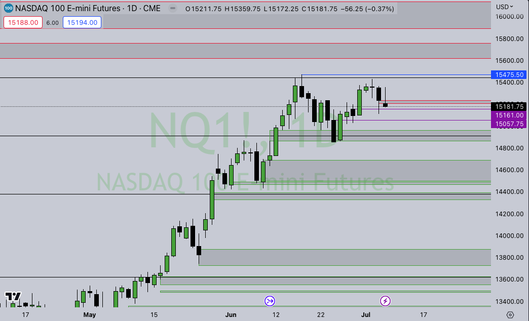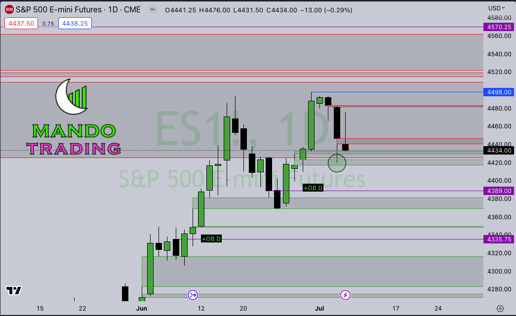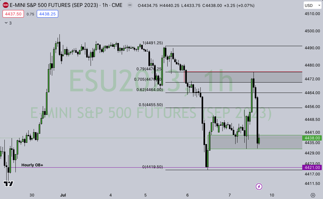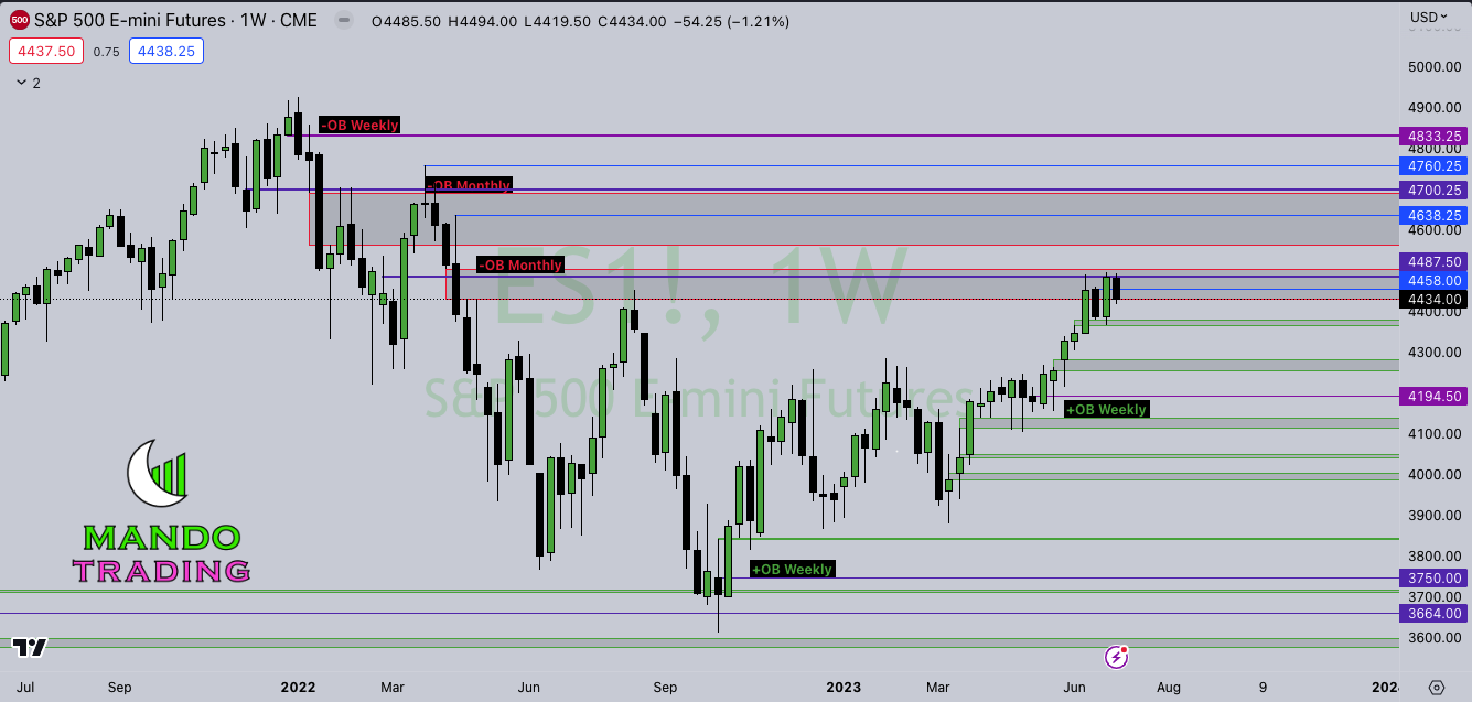 ES DAILY – Nasty candle Friday, setting up another bearish volume imbalance. Two levels I am looking towards to offer some support are 4425 and 4417. If ES is to slip up I see some downside to 4389, which is a daily bullish order block dating back to 6/27… If support holds up my upside target to fill in the current bearish imbalance is 4503.