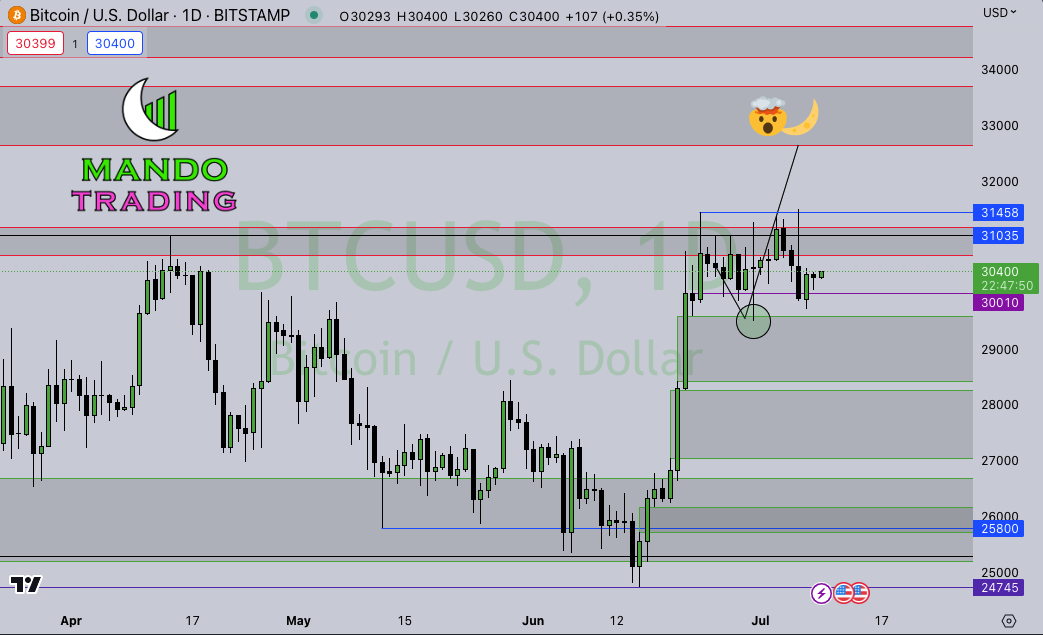 BTC (CRYPTO: BTC) – I drew the forecast about two weeks ago now, and it has pretty much moved in slow motion… While I still favor a move towards 32k, I’d prefer that bitcoin did not drop into support a second time, and would like to see some bullish order flow come in to drive price higher, quickly.