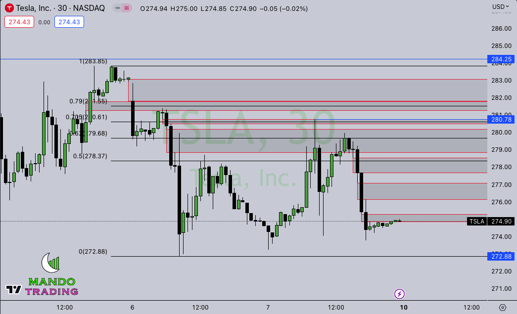 TSLA (NASDAQ:TSLA) – Range set on Thursday and rejected a premium imbalance (above 50%). I think TSLA is in a pretty big spot… A hold here and I think prices can bounce and challenge the high of 284.25. Taking out the low of 272.88 and I think a staircase down can start to set up.