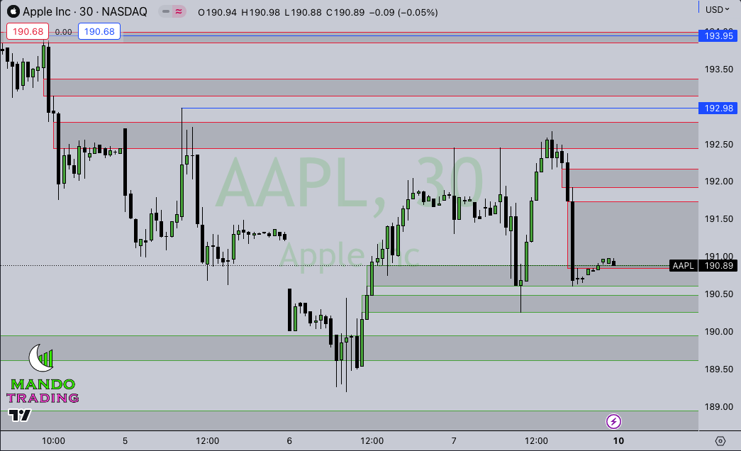 AAPL (NASDAQ:AAPL) – premarket bounce from support created Thursday morning up to the dreaded 192.50 level that has rejected about 17 times in the last week. Price flushed hard, creating some resistance on the way down, before finding support again. Below support at 190.50 and I’ll look for lower prices.