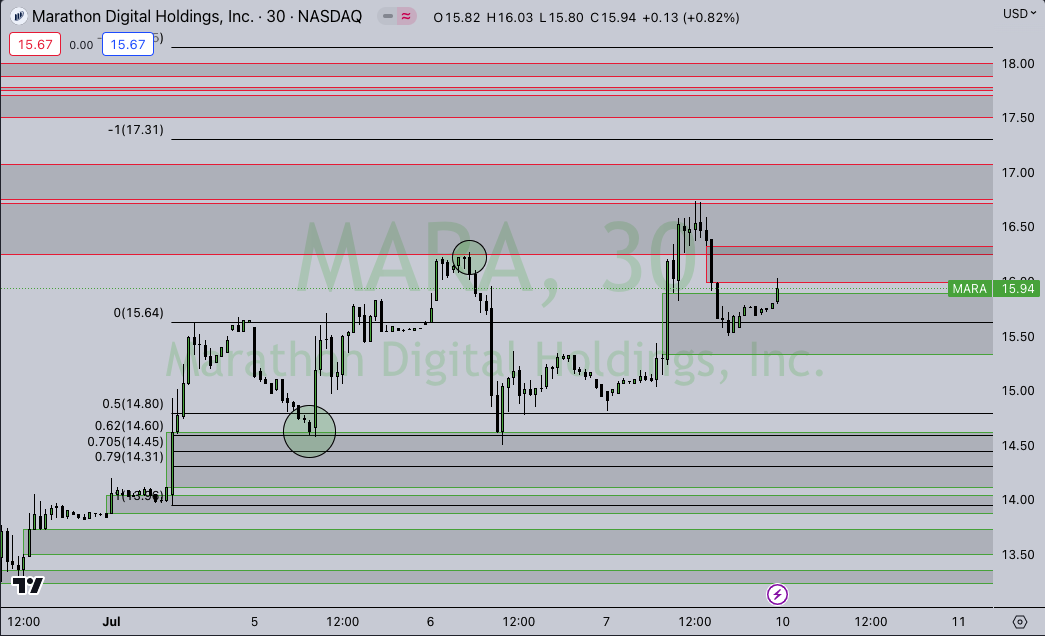 MARA (NASDAQ:MARA) – still following trend, with a run into resistance and setting a new short term high. Rejected to the tick and pulled back into support. If my BTC idea plays out, MARA has some more room to the upside.