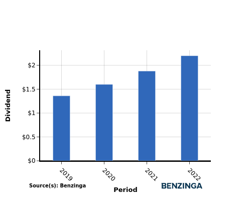 From 2019 to 2022, the company’s dividend per share showed a positive trend, increasing steadily from $1.36 in 2019 to $2.20 in 2022. This demonstrates the company’s commitment to rewarding shareholders by consistently raising dividends.