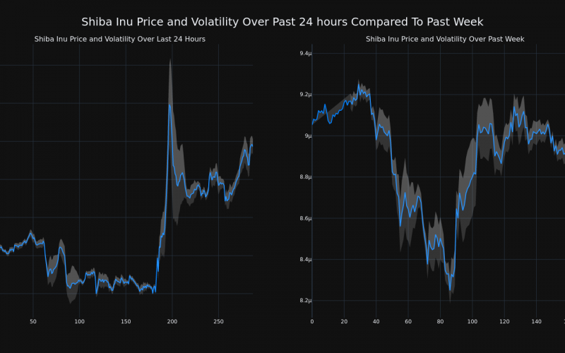 The chart below compares the price movement and volatility for Shiba Inu over the past 24 hours (left) to its price movement over the past week (right). The gray bands are Bollinger Bands, measuring the volatility for both the daily and weekly price movements. The wider the bands are, or the larger the gray area is at any given moment, the larger the volatility.