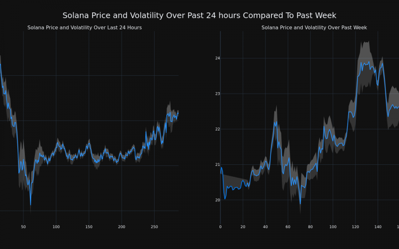 The chart below compares the price movement and volatility for Solana over the past 24 hours (left) to its price movement over the past week (right). The gray bands are Bollinger Bands, measuring the volatility for both the daily and weekly price movements. The wider the bands are, or the larger the gray area is at any given moment, the larger the volatility.