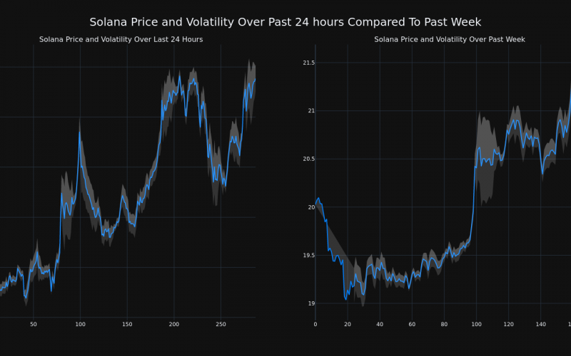 The chart below compares the price movement and volatility for Solana over the past 24 hours (left) to its price movement over the past week (right). The gray bands are Bollinger Bands, measuring the volatility for both the daily and weekly price movements. The wider the bands are, or the larger the gray area is at any given moment, the larger the volatility.