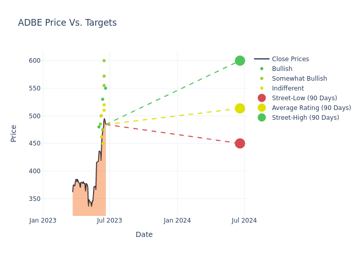 According to 20 analyst offering 12-month price targets in the last 3 months, Adobe has an average price target of $498.95 with a high of $600.00 and a low of $415.00.