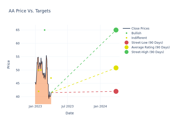 According to 7 analyst offering 12-month price targets in the last 3 months, Alcoa has an average price target of $51.57 with a high of $65.00 and a low of $42.00.