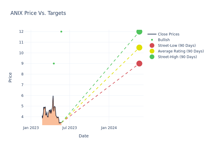 According to 6 analyst offering 12-month price targets in the last 3 months, Anixa Biosciences has an average price target of $10.83 with a high of $12.00 and a low of $9.00.