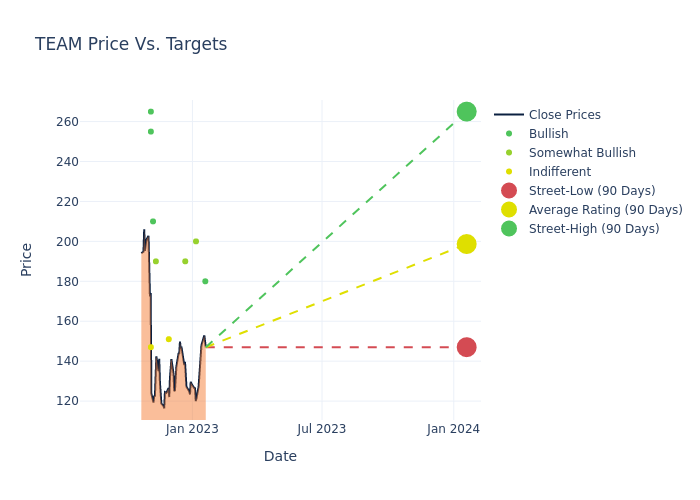 In the last 3 months, 14 analysts have offered 12-month price targets for Atlassian. The company has an average price target of $198.43 with a high of $265.00 and a low of $147.00.