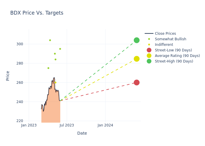 In the last 3 months, 6 analysts have offered 12-month price targets for Becton, Dickinson. The company has an average price target of $284.67 with a high of $304.00 and a low of $260.00.