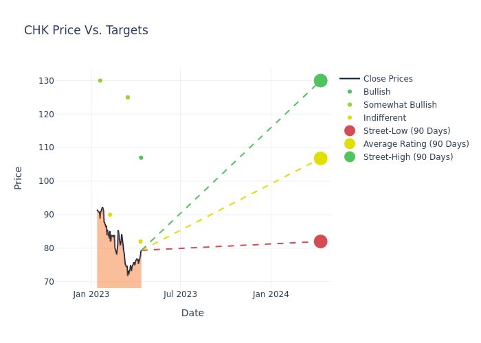 According to 7 analyst offering 12-month price targets in the last 3 months, Chesapeake Energy has an average price target of $105.43 with a high of $130.00 and a low of $82.00.