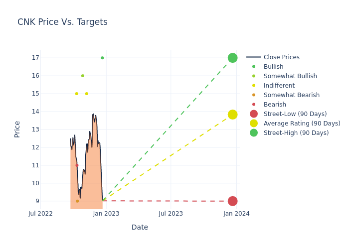 According to 6 analyst offering 12-month price targets in the last 3 months, Cinemark Hldgs has an average price target of $13.83 with a high of $17.00 and a low of $9.00.