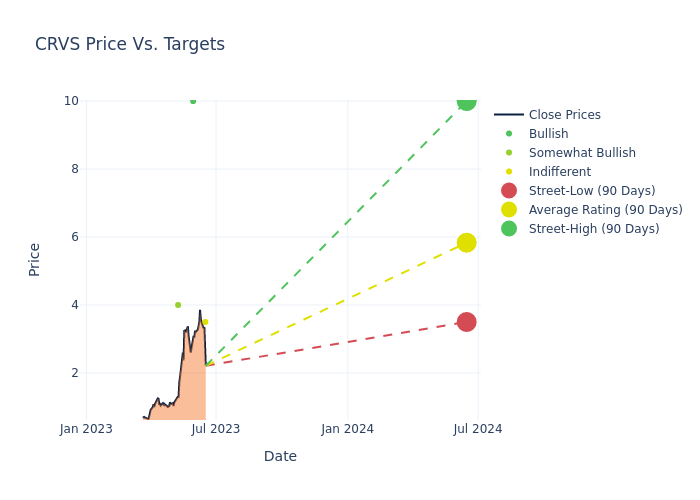 In the last 3 months, 4 analysts have offered 12-month price targets for Corvus Pharma. The company has an average price target of $5.25 with a high of $10.00 and a low of $3.50.