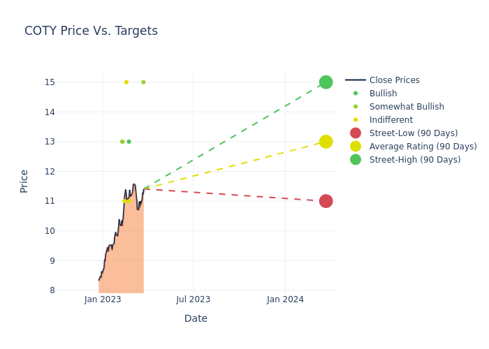 According to 13 analyst offering 12-month price targets in the last 3 months, Coty has an average price target of $12.08 with a high of $15.00 and a low of $9.00.