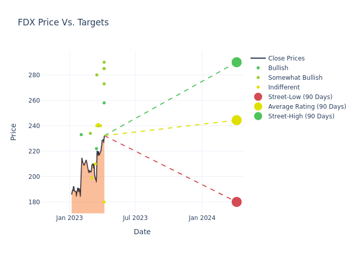 These 23 analysts have an average price target of $244.96 versus the current price of FedEx at $232.2, implying upside.