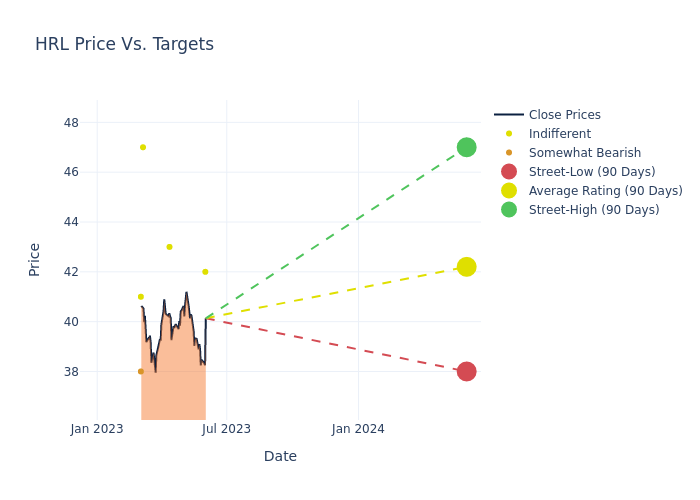 According to 3 analyst offering 12-month price targets in the last 3 months, Hormel Foods has an average price target of $44.0 with a high of $47.00 and a low of $42.00.