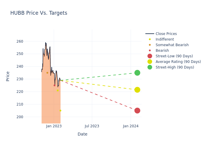 These 6 analysts have an average price target of $227.0 versus the current price of Hubbell at $228.95, implying downside.