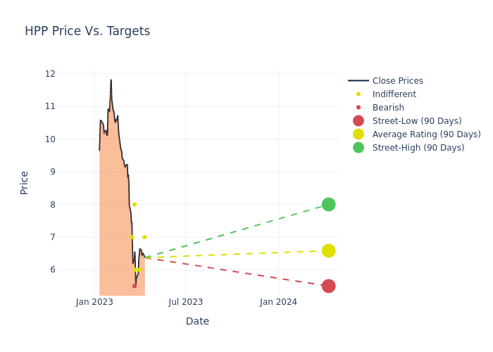 According to 6 analyst offering 12-month price targets in the last 3 months, Hudson Pacific Properties has an average price target of $6.58 with a high of $8.00 and a low of $5.50.
