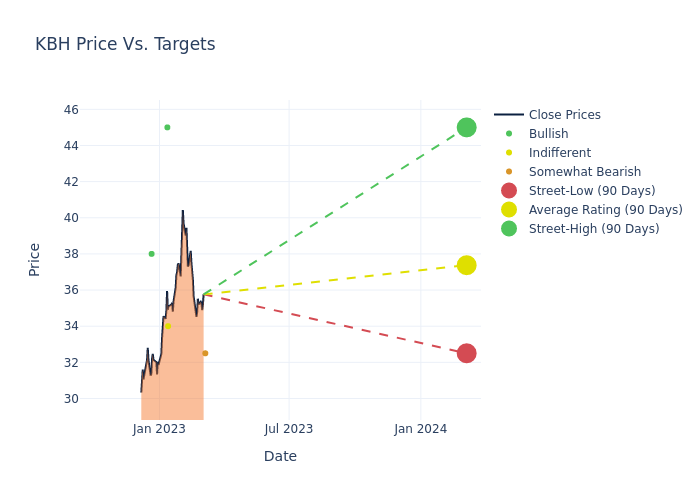 According to 4 analyst offering 12-month price targets in the last 3 months, KB Home has an average price target of $37.38 with a high of $45.00 and a low of $32.50.