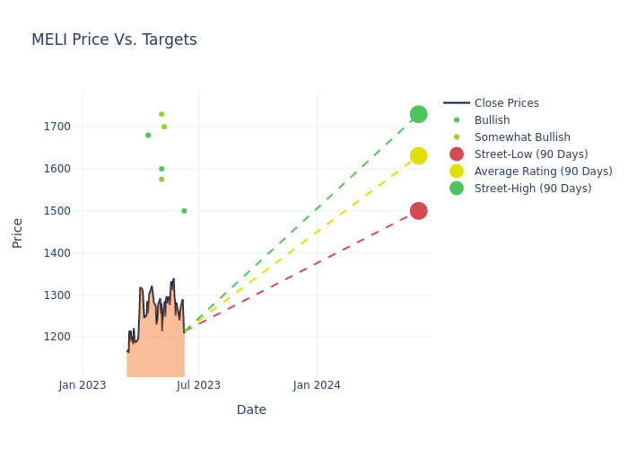 According to 8 analyst offering 12-month price targets in the last 3 months, MercadoLibre has an average price target of $1626.25 with a high of $1730.00 and a low of $1500.00.