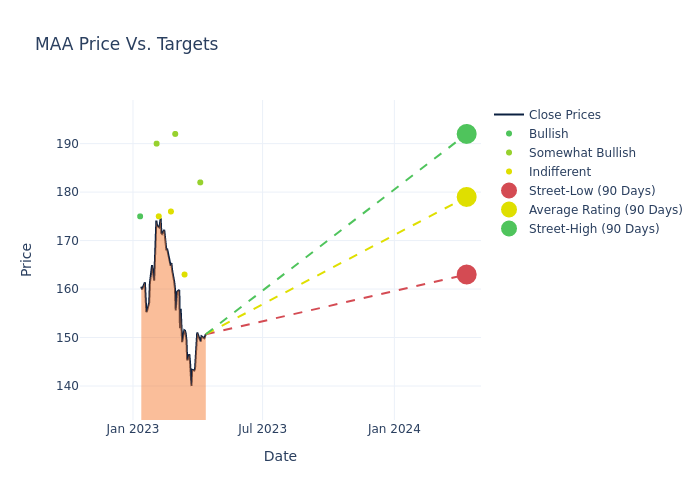 According to 7 analyst offering 12-month price targets in the last 3 months, Mid-America Apartment has an average price target of $176.71 with a high of $192.00 and a low of $159.00.