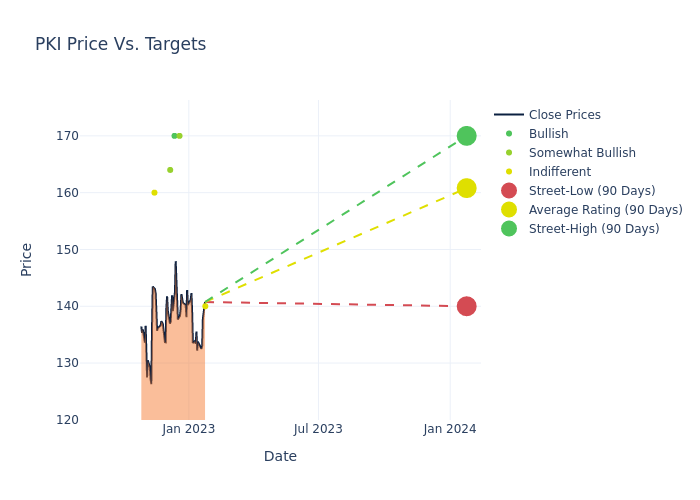 According to 6 analyst offering 12-month price targets in the last 3 months, PerkinElmer has an average price target of $158.17 with a high of $170.00 and a low of $140.00.