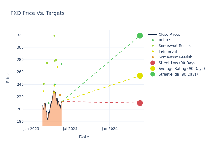 According to 23 analyst offering 12-month price targets in the last 3 months, Pioneer Natural Resources has an average price target of $254.74 with a high of $322.00 and a low of $210.00.