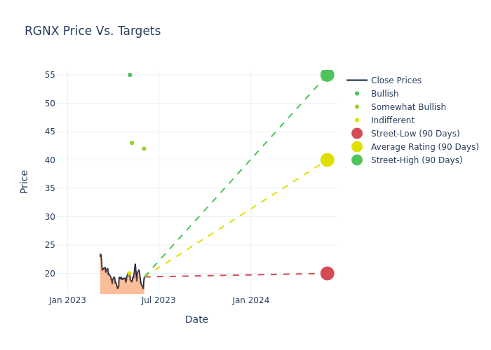 According to 5 analyst offering 12-month price targets in the last 3 months, Regenxbio has an average price target of $41.2 with a high of $55.00 and a low of $20.00.