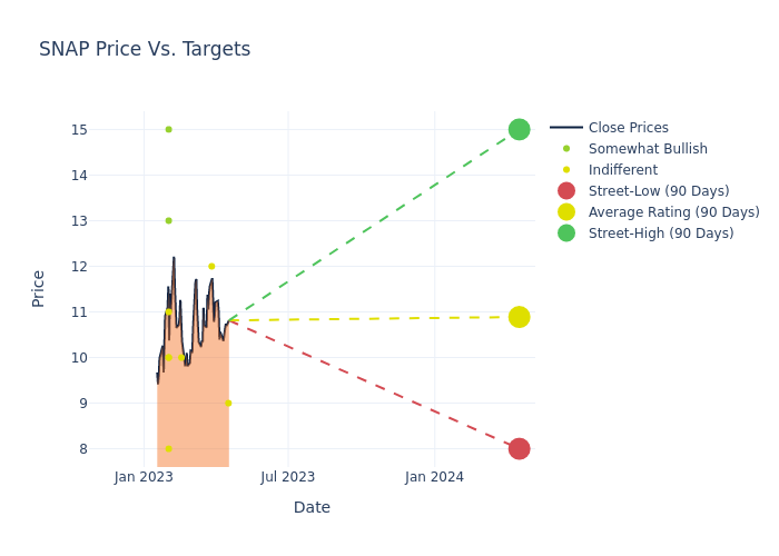 These 12 analysts have an average price target of $11.42 versus the current price of Snap at $10.815, implying upside.
