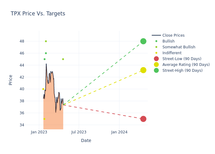 These 5 analysts have an average price target of $43.8 versus the current price of Tempur Sealy Intl at $37.33, implying upside.