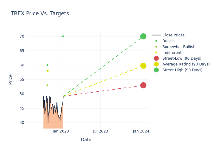 According to 6 analyst offering 12-month price targets in the last 3 months, Trex Co has an average price target of $63.17 with a high of $80.00 and a low of $53.00.