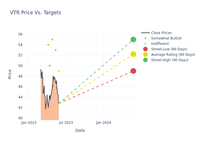 In the last 3 months, 6 analysts have offered 12-month price targets for Ventas. The company has an average price target of $51.83 with a high of $55.00 and a low of $49.00.